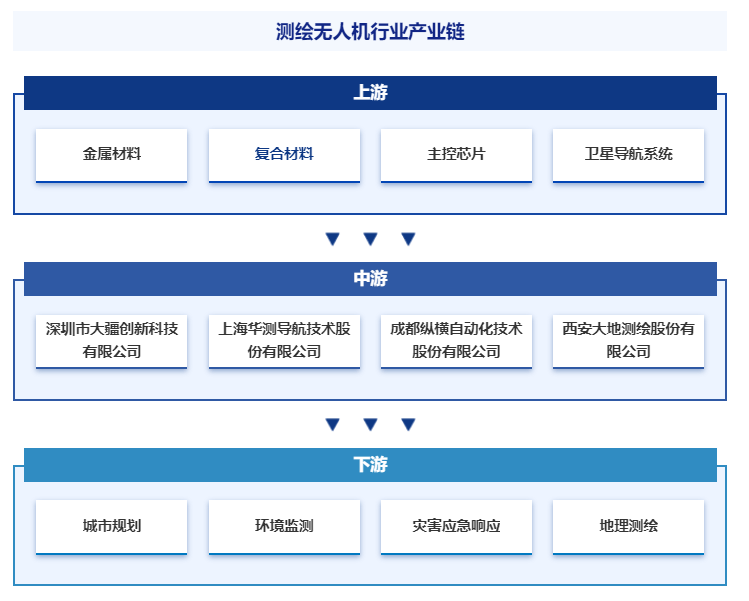 做为新兴财产,测绘无人机行业具有较高的手艺壁垒,这是因为测绘无人机产物融合了卫星定位、无线通信、测绘、软件、收集、算法等多种手艺,逾越多种学科门类,控制焦点手艺的难度较高,需要持久的手艺堆集。各出产测绘无人机的企业需要对客户的需求进行深切理解,并针对性、定制性的开辟,从而出产出满脚客户需求的产物。新进入测绘无人机行业的企业很难正在短时间内堆集脚够的手艺并快速实现财产化,面对较高的手艺壁垒。对于办理、研发、出产、发卖、办事等相关人才的专业能力要求很高。目前,我国测绘无人机行业的高程度办理人才以及手艺专业人才相对缺乏,这也是我国测绘无人机行业成长的一个限制要素。新进入测绘无人机行业的企业很难正在较短时间内扶植一支经验丰硕的优良人才团队,面对较高的人才壁垒。测绘无人机行业下旅客户敌手艺的专业性要求较高,对供应商理解本身需求的精确性要求较高,需要专业的办事团队操纵较长的时间去指导和培育。因为测绘无人机的手艺线和操做流程相对复杂,用户一旦选择某家测绘无人机企业的产物和办事并构成利用习惯,往往会对其手艺线发生依赖,从而对供应商发生较高的认同感和粘性。因而用户对市场中先发品牌的忠实度较高,新进入者需要面对必然的品牌壁垒。测绘无人机行业培育期较长,对持久资金的需求程度较高。前期手艺和产物的研发需要投入大量资金,跟着测绘无人机行业使用不竭拓展,手艺要求不竭提拔,客户需求逐步升级,测绘无人机企业需要持续的资金投入以手艺升级取产物更新换代。新进入者需投入大量资金,面对必然的资金壁垒。测绘无人机行业财产链是一个涵盖从原材料供应、无人机制制到使用范畴等多个环节的完整生态系统。财产链上逛次要是原材料供应和环节零部件制制,次要包罗金属材料、复合材料、从控芯片、卫星系统等。财产链中逛为测绘无人机制制。财产链下逛为测绘无人机的使用,包罗城市规划、监测、灾祸应急响应、地舆测绘等。