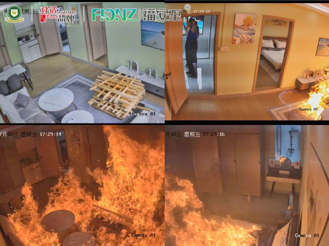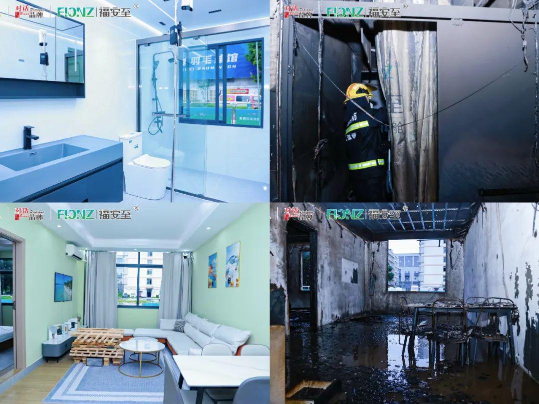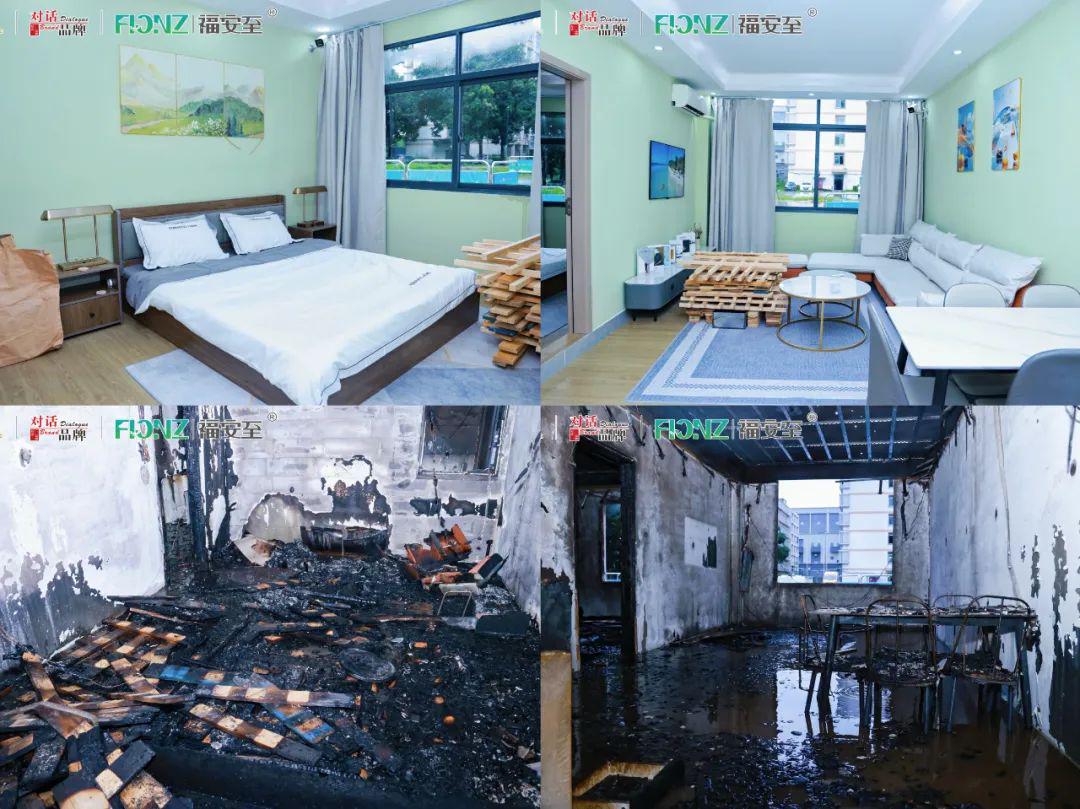 实烧尝试,正在空阔的广场搭建一房一厅户型的钢混布局板房内举行,按照家庭栖身拆修,设置装备摆设日常利用的家私电器,模仿家庭火警场景,突发火警无法逃生时,由3名体验人员进入到福安至火警自救舱内避险自救。为了查验产物功能,尝试过程模仿极端火警,除了日常家私,还安插了两处木材垛添加可燃物,添加了汽油帮燃,设置玻璃窗指导卧室炊火进入安设福安至火警自救舱的卫生间里,并卫生间房门,让产物炊火。