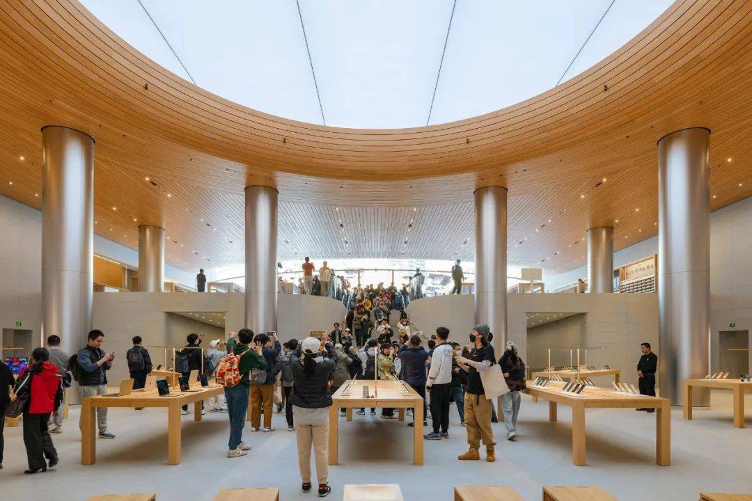 上海 · 苹果静安店位于上海静安区核心地带,项目通细致心设想的新环形公共广场,毗连多层人流,包罗一条平缓的景不雅空中步道。步道上设有高架长廊和天台座椅,广场的环形几何布局不只激励社交互动,还加强了社区认识,成为城市中一个新的场合。