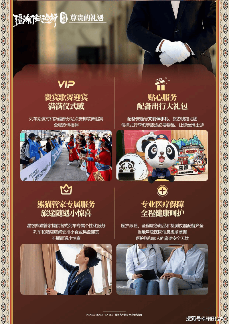 “熊猫专列·安闲号”是做为中国铁成都局集团无限公司运营的精品旅逛列车,熊猫专列是以熊猫为从题的精品列车,采用25G型客车,融合了四川、贵州、沉庆的文化特色,供给立异的舒服性、完整的功能性和前沿的智能化设备。从智能电子锁到恒温淋浴,每一细节都为搭客细心设想,确保旅途的每一刻都充满惬意。熊猫专列·安闲号,引领“铁+旅逛”新风尚,让每一段路程都成为夸姣回忆。以下是对熊猫专列的细致引见以及订票体例。,以下是对其的细致引见:关于更多相关2025年熊猫专列简介,2025年熊猫专列订票流程,2025年熊猫专列发班日期,2025年熊猫专列旅逛线年熊猫专列预定留意事项,欢送关心我们。因为熊猫专列属于定制旅逛专列,按期发班;您提前预订,免得影响您的出行,因为乘坐熊猫专列一部门旅客为国外旅客,根基都是正在提前一年预定了第二年的旅逛打算,部门席位及团期曾经余位不多,良多多伴侣2024年没有赶上这趟中国新疆奢华旅逛专列,有打算2025年乘坐熊猫高级旅逛专列的旅客伴侣目前能够尽快预订;大师有打算加入预订熊猫专列的伴侣们能够征询拨打新疆熊猫专列订票核心专线一、熊猫专列安闲号根基概况